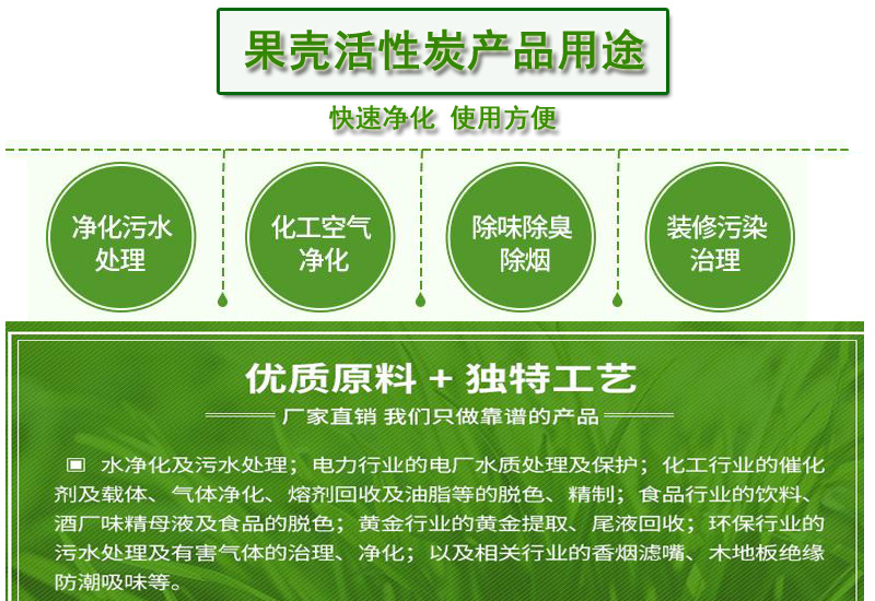 家居裝修應用:產(chǎn)品采用優(yōu)質(zhì)果殼、椰殼為原料,無毒、無害,能有效吸附家居裝修過程中產(chǎn)生的甲醛、甲苯、氨類等有毒氣體,安全、凈化居室空氣。