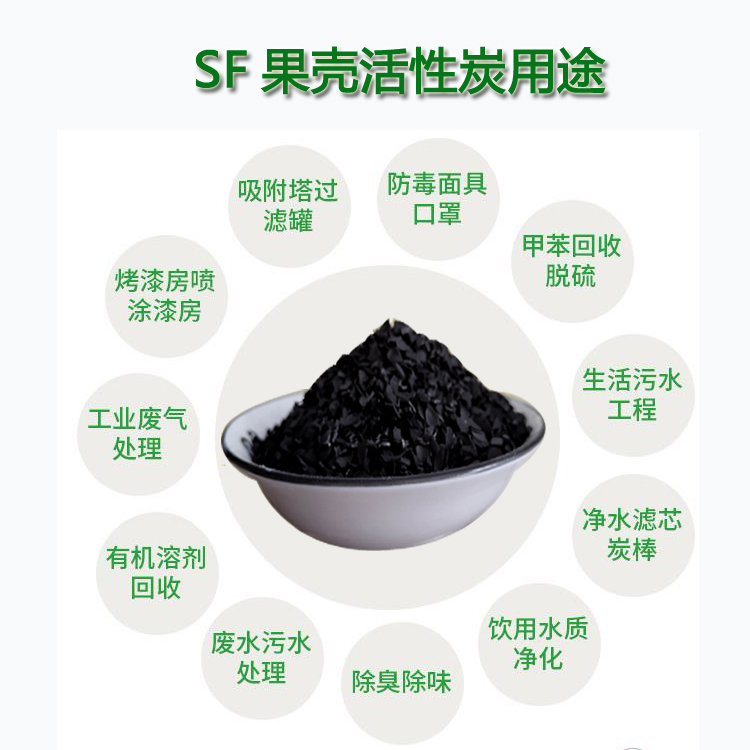 水處理應(yīng)用:產(chǎn)品采用優(yōu)質(zhì)果殼、椰殼為原料,廣泛應(yīng)用于飲用水、生活用水,飲料用水、自來水廠、電廠鍋爐用水、工業(yè)純水凈化,也用于各種工業(yè)廢水的凈化、提純等,可有效去除水中的有機(jī)物、異味、余氯、酚、汞、鐵、鉛、砷、鉻、硅膠、氰化物等有害物質(zhì)及有效除嗅去色。